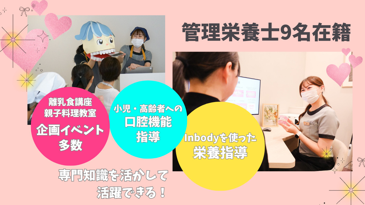 管理栄養士としての専門性を活かしながら、 歯科助手・受付業務も兼任していただきます。 ・受付業務 ・診療補助業務 ・食育・食事指導・口腔機能管理 ⚪︎トリートメントコーディネーター業務 └ 患者さんの思いをくみ取り、治療説明や不安の軽減を行います ⚪︎エデュケーター業務 └ 小児矯正における呼吸・姿勢・嚥下(飲み込み)の指導 └ お子さまの成長を間近で感じられる、やりがいのある仕事です ※詳しい内容は、見学時に丁寧にご説明します。