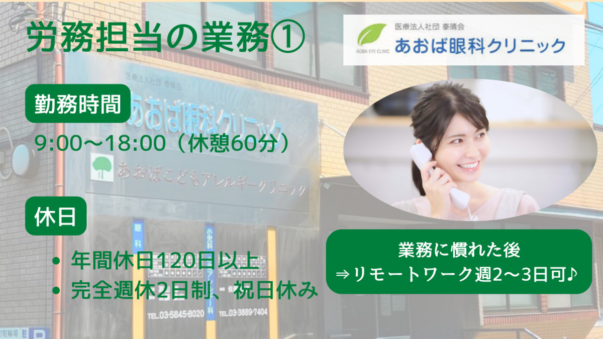 ■勤怠管理、給与や給与計算を委託している外部企業への指示、確認業務 ■入退社、休職手続き、社会保険・労働保険手続き全般 (職員120名程度を対応) ■36協定の作成、届出 ■人事システムの管理業務 ※使用システム:キングオブタイム、SmartHR、e-Gov、freee人事労務 ■従業員問い合わせ対応 ■その他 事務業務 (各拠点への書類発送など) ☆業務に慣れた後は、リモートワーク週2~3日可☆ 上記いずれかでも経験したことのある業務があれば大丈夫です。 既存スタッフがしっかりと初期教育・サポートさせていただきます。 勤務場所はクリニックの1階や応接室や2階の事務所スペースを活用いただけますが、リモートワークを推奨しておりますため、業務をある程度把握できた段階でリモート率を高めてご勤務いただくことも可能です。 そのため、小さいお子様がいらっしゃる方や介護が必要なご家族様がいらっしゃる場合も勤務しやすい働き方ができます♪