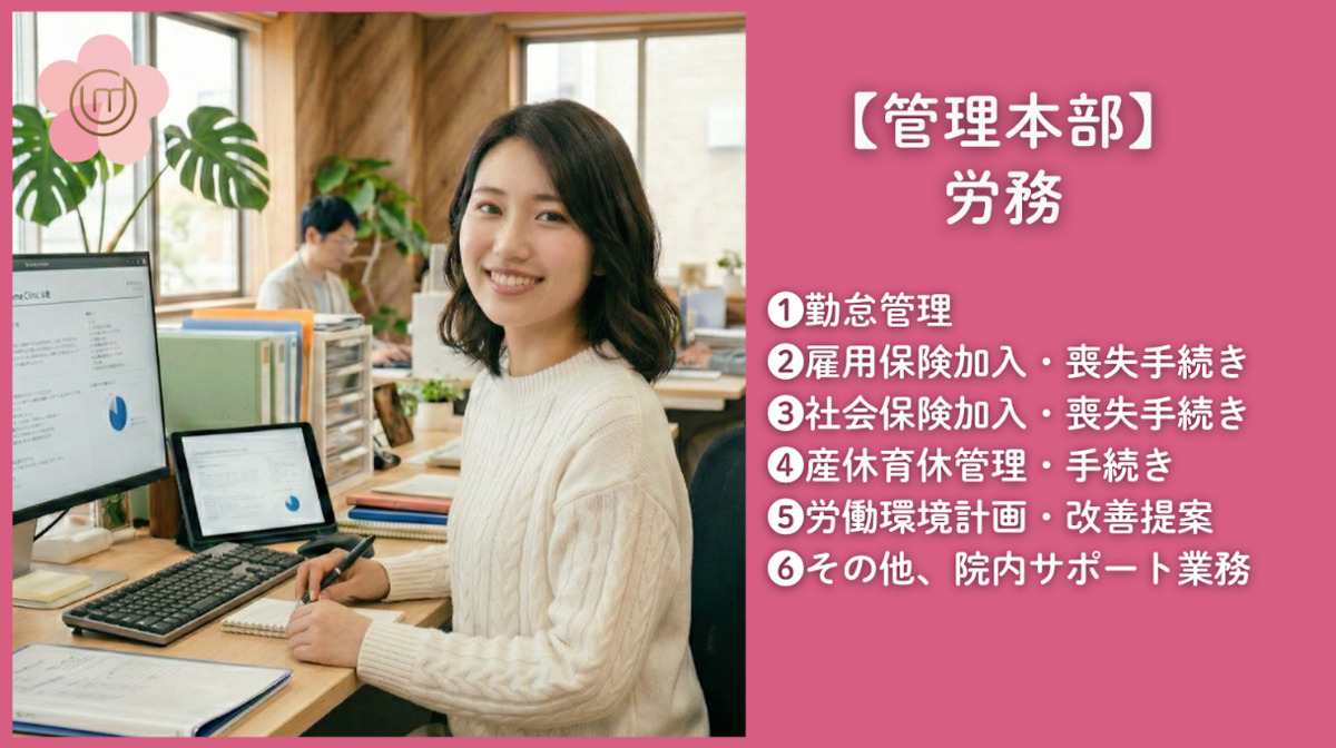 【雇用形態】 正社員 【募集職種】 労務 【募集対象】 管理本部労務 【募集内容】 労務職員を募集します。 募集する職務内容は以下の通りです。 <❶【労務部】> ⭕️概要: 医療品質を支える重要な役割として、【労務】のメンバーを積極募集しています。 勤怠管理、産休育休管理、雇用保険、社会保険の加入・喪失の対応など、 労務としても幅広い経験が可能です。 ⭕️募集対象: ・労務職未経験でも可 ・経験者 歓迎 ・医療事務資格 不要 ⭕️キャリア: ①経験を積んだ先で労務リーダーへの登用も可能です。 ②希望があれば、他部門への異動も可能です。 ⭕️職務内容: ①勤怠管理 ②雇用保険加入・喪失手続き ③社会保険加入・喪失手続き ④産休育休管理・手続き ⑤労働環境計画・改善提案 ⑥その他、院内サポート業務 【電子カルテ】 モバカル 【社内プラットフォーム】 Google Workspace 従事すべき業務の変更:なし 就業場所の変更:なし
