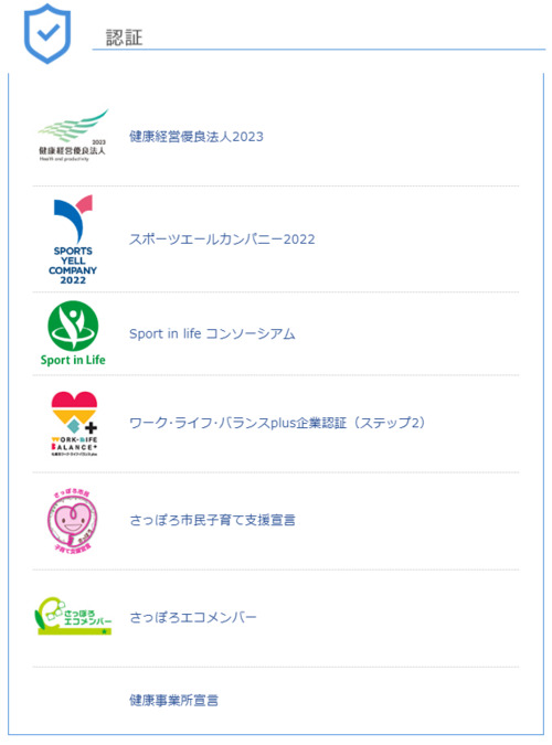 雇用保険、労災保険、健康保険、厚生年金 退職金共済加入 定年制あり(一律60歳) 再雇用制度あり(65歳まで) 勤務延長あり 利用可能託児施設あり(連携保育園) 受動喫煙対策あり(屋内禁煙) マイカー通勤可(駐車場は自己確保・自己負担) さぽーとさっぽろ加入(1年後より) セミパーソナルフィットネススタジオ社員価格利用可能 提携企業割引あり(サツドラ・オートバックス)お会計時5%オフ 提携不動産取扱店あり 研修制度あり ・拠点別研修 月1~2回開催 ・階層別研修 都度