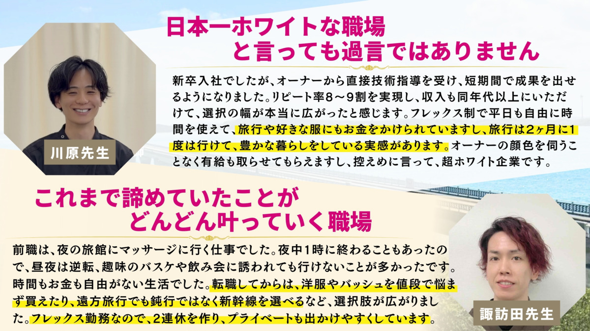 残業の強制はなく、自費での施術のため面倒なレセプト作業などはございません。出社・退社時間や有給休暇の取得もライフスタイルに合わせて柔軟に対応します。