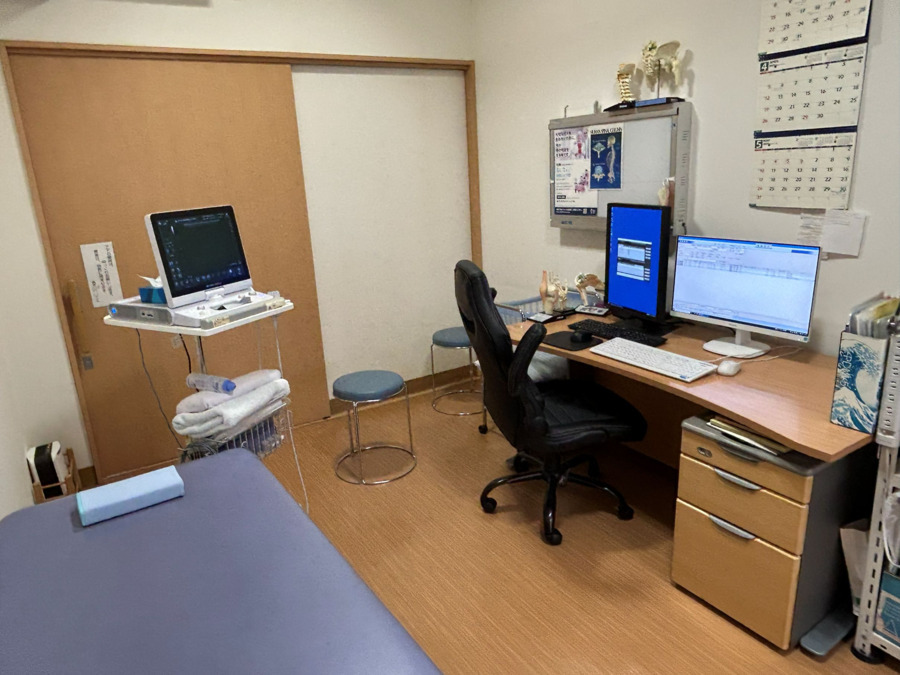 - 診療室やリハビリ室にはエコー器が設置されており、ドクターやスタッフと密に情報共有しながら診断・治療に活用しています。