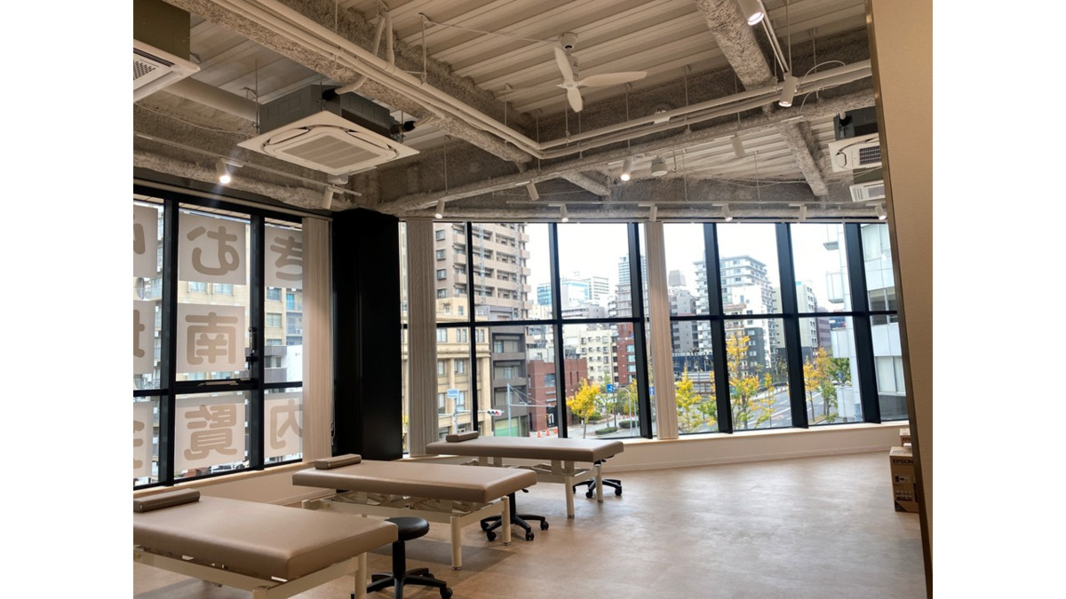 - クリニックは、新築4階ビルの3階にあり、一面がガラス・鏡張りで、天井も吹き抜けのため開放的なリハビリ室となっています。