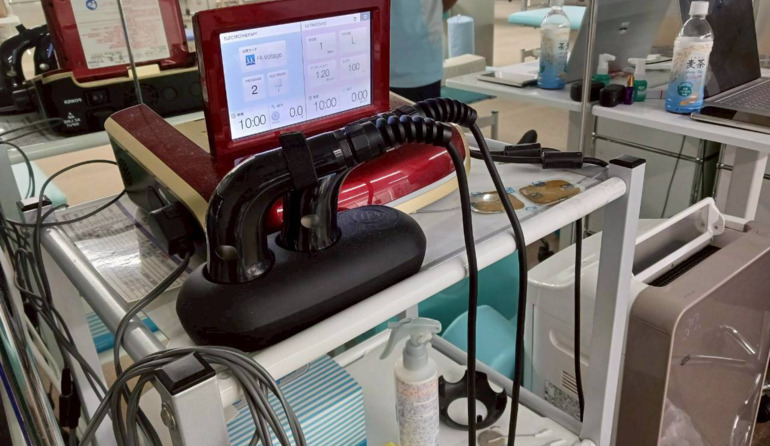 スタッフ1人あたり5人くらいを担当 1人あたり20~40分のリハビリです。 ※午前中は地域の高齢者の方が多く来院されます。 ※写真は超音波骨折治療器です。