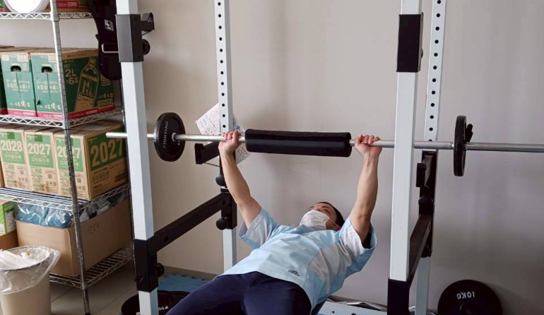 14時まで休憩です。 休憩室には筋トレ器具も置いてあり、休憩中にトレーニングをする人も。