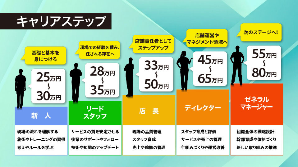 月給は、経験・スキル・役割に応じて決定します。 キャリアステップに応じた評価制度があり、役割の拡大や成果に応じて昇給・昇格を目指せます。 ◇ 試用期間あり(条件変更なし/期間3ヶ月) ◇ 残業が発生した場合は、実働時間に応じて別途残業代を支給 ◇ トレーニング業務や店舗運営に関わる場合は評価に反映