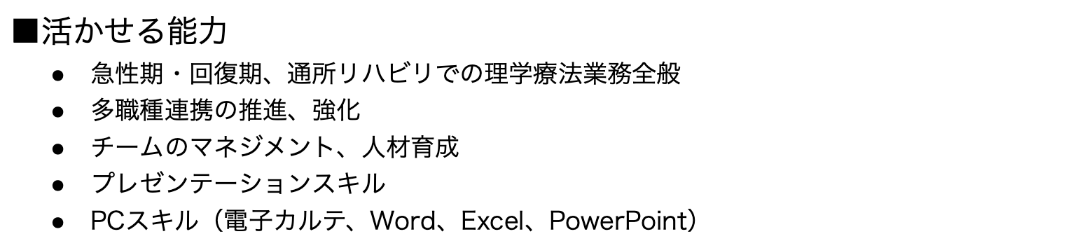 自分の能力や技術、知識としてアピールできることを箇条書きで記載します。理学療法スキルのほか、PCスキルなど業務にプラスとなる能力があれば記載しましょう。